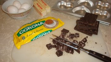 before i could do anything, i had to decide on a chocolate to use in the flourless chocolate valentino cake.  if you’ve shopped for chocolate recently then you know that it can be a challenge to choose from the many types available.  i looked at so many.  some were flavored with caramel, nuts, coffee or chili.  others had cacao contents of 65-80% making them dark and bitter.  then there was white and milk chocolates.  oh, the choices…keep in mind, i haven’t gone anywhere but the local grocery store, never mind the internet where i could have found so much more.  in the end, i made a trip to an international grocery store in search of ibarra, a mexican chocolate.  they did not have it so i chose corona, a columbian chocolate that is flavored with cinnamon and cloves.  if you’ve ever seen ibarra, then you are familiar with the grainy-sugary consistency of the chocolate.  corona is much the same but it does not have the almonds that ibarra has.  in the end, the chocolate gave the cake a mild flavor, not too dark and nicely fudgy with a slightly spicy finish.  if i ever use this recipe again, i will add sugar to the egg whites to stabilize them and allow them to fold in to the batter more smoothly.  for visual impact, i baked the batter in individual hearts and using the instant read thermometer did not help.  next time, i will go by feel instead-25 years of experience must be good for something.