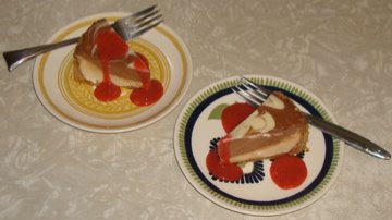 when all else fails and your imagination is at a standstill, just clean out the fridge. or at least stand there while your husband does and you can grab things as he decides to pitch them or you can let that be your inspiration. we had so many little tubs and bowls of stuff piled behind so many half full containers that we could not find anything in there. it was time for all of those lazy squatters to go! first stop was the pantry, i needed a crumb crust. i was in luck, there was a bag of biscotti crumbs left over from something and a partial bag of hazelnut pieces, a little black sugar, some melted butter and voila! a crust is born. in to the cheesecake went some sour cream since we had two open tubs and we were out of heavy cream. in the freezer i found some bananas that were over ripe and saved for just such an occasion. back into the pantry and my search yielded a little colombian chocolate from the valentino challenge. i flavored the batter with the banana and poured 2/3 of it into pans. the remaining third was mixed with the chocolate which i had melted and this batter was swirled into the batter in the pans to make a marbled cheesecake. when it was all said and done, the cakes were cold and ready to come out of their pans, i headed back to the freezer and used some frozen strawberries to make a nice sauce. there you have it, banana split cheesecake! it was simple to do and my pantry as well as the fridge and freezer are a little less cluttered! thanks for the challenge Jenny, it was fun!