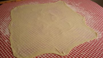 i made two batches of dough just like the directions suggested. i covered the table in a cloth and i pulled and pulled but did not quite reach the 2’x3′ that the recipe stated. however, i was close enough and decided to proceed. doing this reminded me of my days at the cia in our baking class. we were split into two teams and each team was handed a ball of phyllo dough. whichever team pulled it and stretched it the most with out tearing it, won. and that is about all i remembered until i began using the backs of my hands to stretch out this dough…