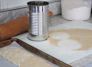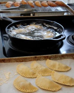 i made my dough the day before and then took it out to soften. when it was ready to be rolled, i grabbed my high dollar cutter (an empty family size soup can) and the biggin (my favorite big rolling pin) and i rolled out all of the dough circles. i also made the filling in advance so i was able to then start filling and sealing the pies. in the mean time, the oil was heating on the stove in my cast iron skillet.