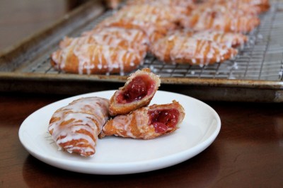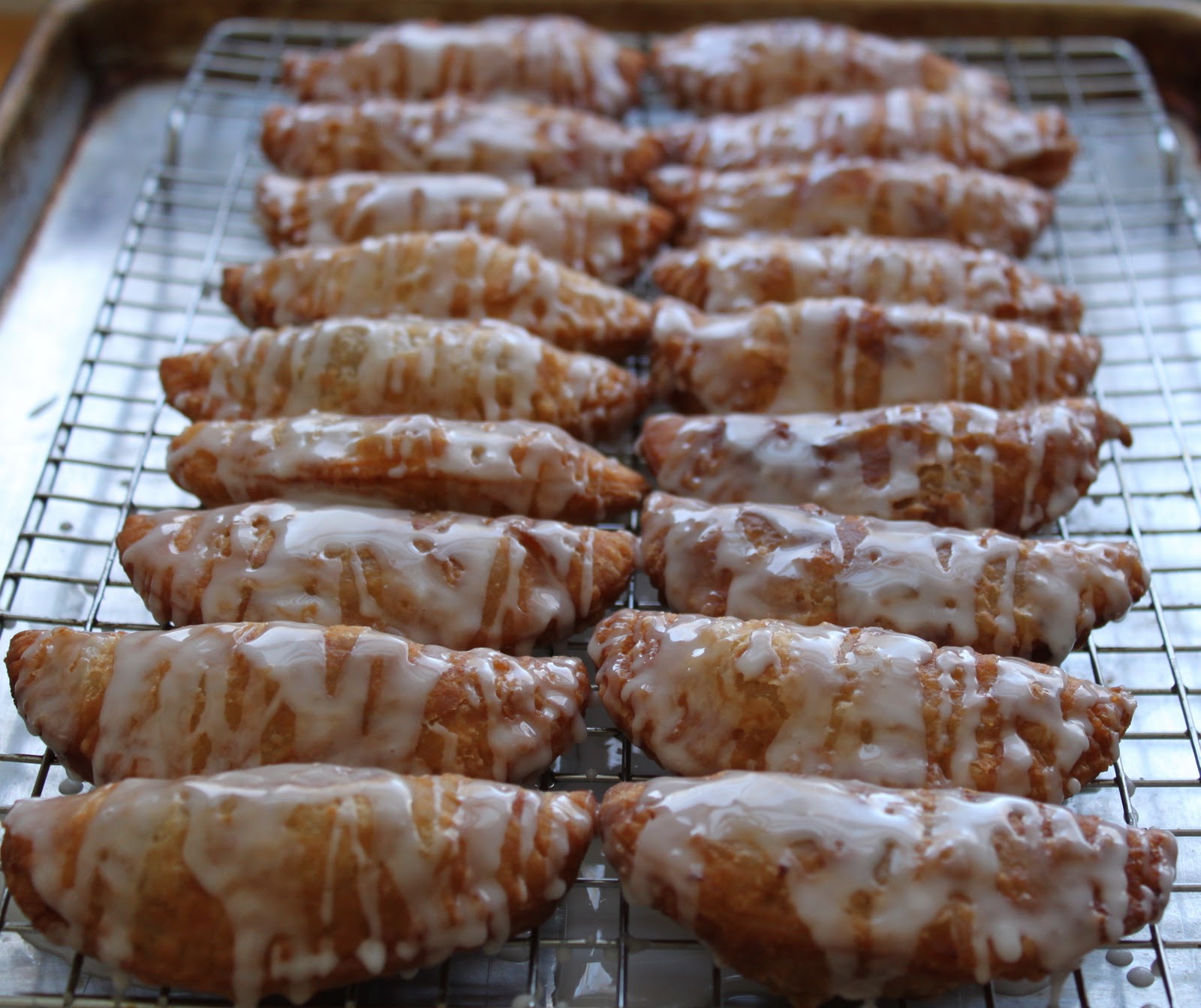 cut the dough into 2 equal pieces. roll out the dough a bit thinner than you would for a pie, somewhere between an eighth and a sixteenth of an inch. using a 4” cutter, cut as many circles as possible by positioning the cuts close together. do not worry if some of the circles overlap slightly or if you have imperfections, it is not crucial to have perfect circles. repeat this with the other half of the dough. there should be about 12 circles at this point. gather the scraps, pat them together and roll the dough out again. you should get about 6 more circles. place the oil in the skillet, attach a thermometer to the side of the pan and heat to 350 over medium low heat. while the oil heats, place a few circles of dough onto your work area, brush off the excess flour and place a scant tablespoon(almost a full #50 scoop) of filling in the center of each circle. brush half of each circles edge with the egg wash. fold over the dough and seal it shut with your fingertips first and then with the tines of a fork to be certain the seal is firm. when the oil is at temperature, carefully lower 3 to 4 pies into the oil with out splashing. allow the pies to fry on each side for 2-3 minutes or until a nice golden brown color is achieved. turn them carefully so that you do not splash oil. lift the pies out of the oil and place them on a rack to drain. fry the remaining pies in the same manner. to make the glaze, sift the powdered sugar into a bowl and whisk in the water to make a smooth icing. drizzle the icing over the pies with a spoon.