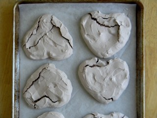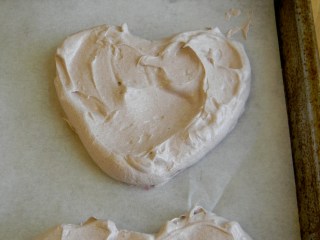 since it was valentine’s day, i decided on a few things; chocolate, hearts and red berries. with that in mind, i set about making chocolate pavlova. here is a close up of the unbaked meringue heart-the first batch made it through before mr. kenmore bit the dust.
