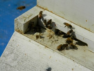 here is a close up of the activity on the front porch. they were out foraging for nectar. believe it or not, there are some flowers out there, mainly what most people call weeds but to us beekeepers, they are beneficial plants since they provide the only nectar at this time of year. so, before you think about that golf course lawn that you’ve always wanted, think about the bees and just let the lawn go-you will feed the bees and help save a stream in the process and save yourself a whole lot of money.