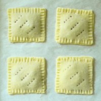 i didn’t need any special equipment either. armed with a set of square cutters that range in size from 1 3/8″ to 2 5/8″, i chose the largest cutter but you could do this just as easily with a ruler and a pizza cutter. to make the fluted edges and to prick the tarts (to allow the steam to escape during baking) i reached into the silverware drawer and used a regular fork.