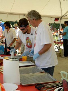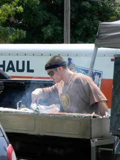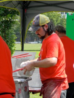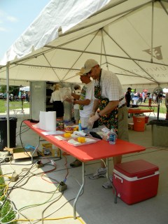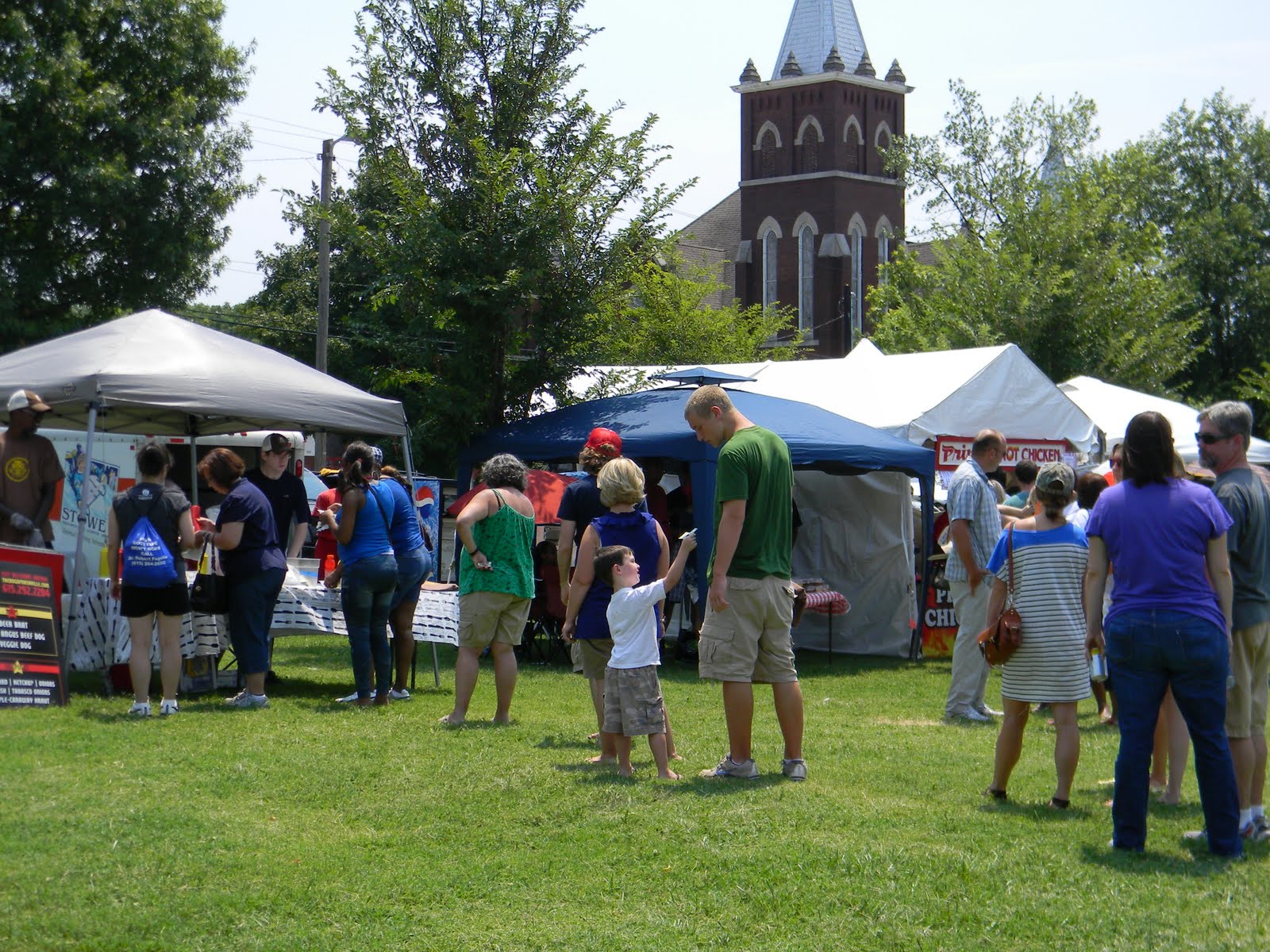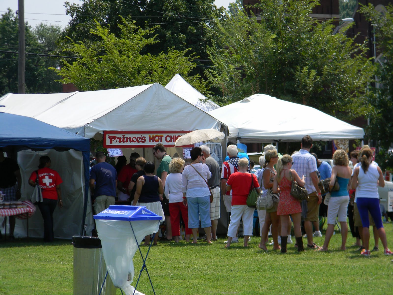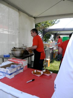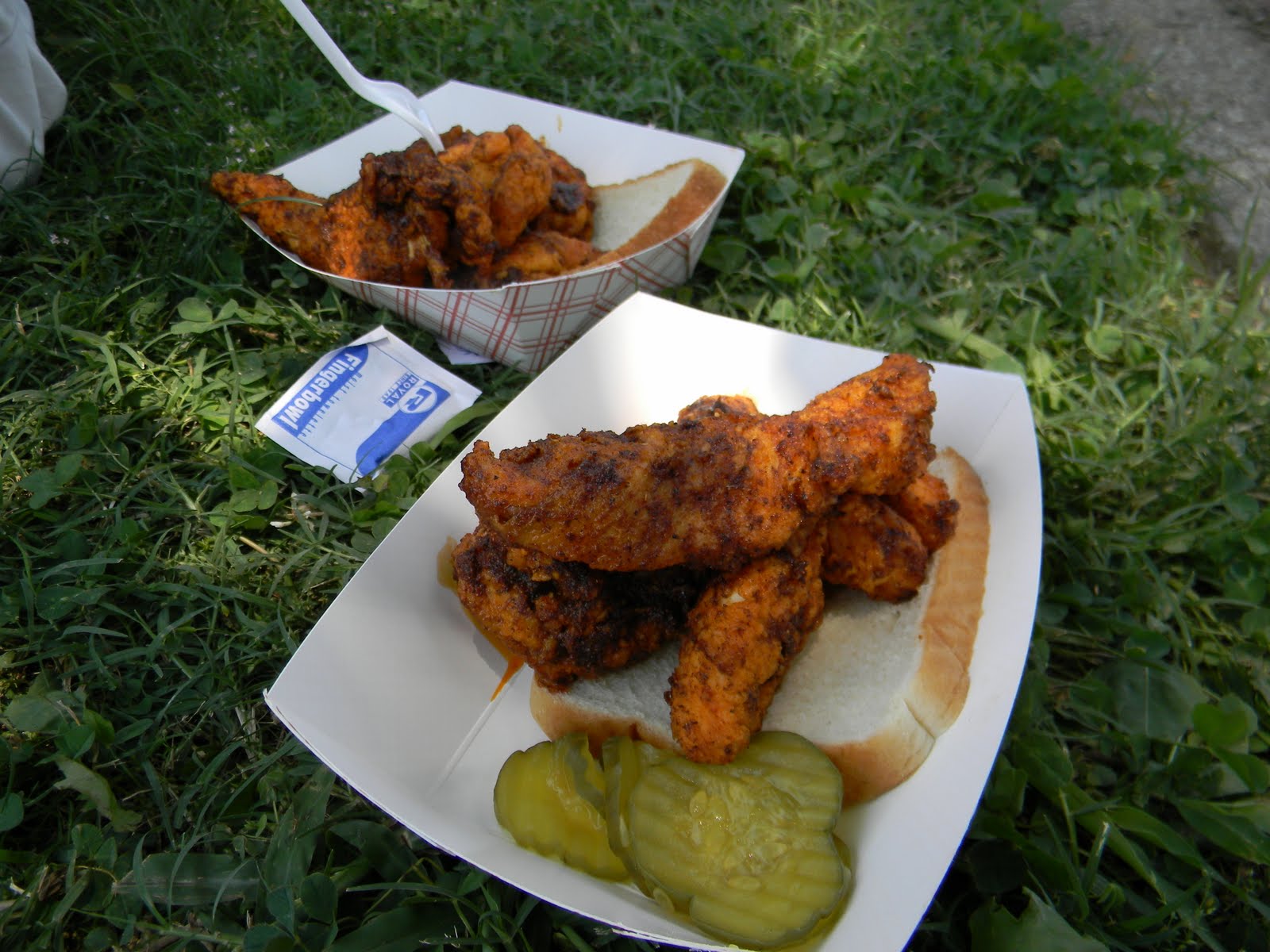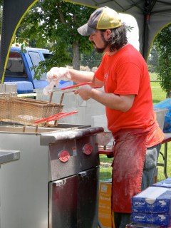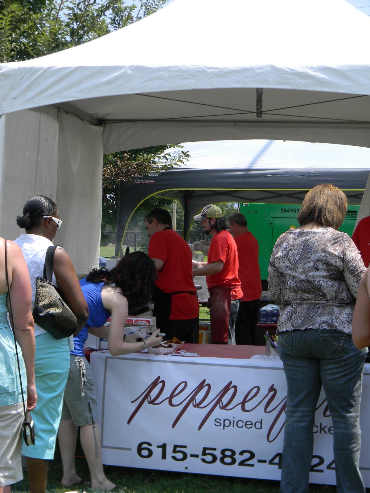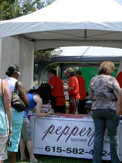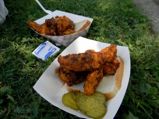 it was the fourth of july, it was hot-really hot and we headed out to the 5th annual hot chicken festival. unless you live around music city, you may not know what hot chicken is. first of all, the word hot has nothing to do with the temperature that the chicken is when it is served. it is all about the hot sauce that the chicken is dipped in after it is fried. kind of like hot wings but better. the chicken is always breaded by hand just before frying and it can either be tenders or cut chicken with bones. after the chicken is deep fried, it is dipped in a hot sauce that can merely singe your taste buds or send smoke out your ears-beware, this ain’t no sissy chicken! even the “mild”ones will challenge you so unless you have an asbestos lining your digestive tract, think twice about asking for “hot” and you just might want to bypass the “extra hot” altogether.