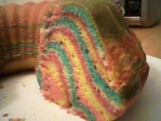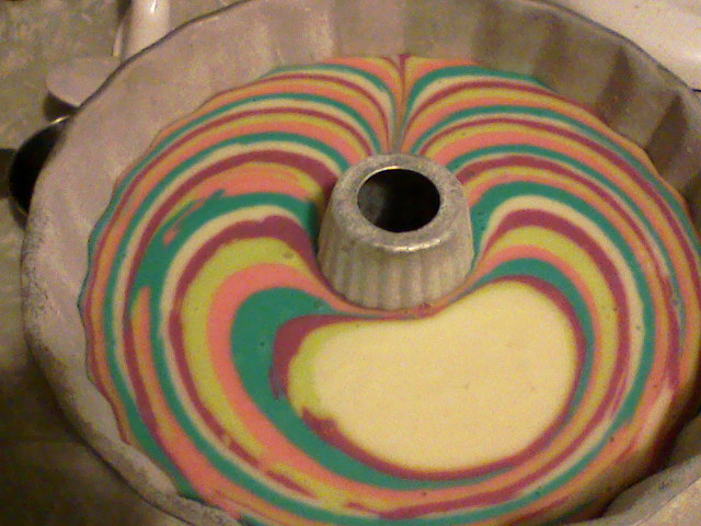 it’s been a month, exactly one month today, that my house was broken into and my computer was stolen.  what a month it has been!  my media tour is moving along and i have replaced my computer-added a security system to the house also since just replacing the doors a second time seemed useless.  let’s hope it makes a difference.  time has flown and things have blurred a bit so imagine my surprise when i realized that i had missed more than half of mary, the food librarians annual bundt fest!!!   i just had to fix that and send some bundt love her way and i couldn’t think of anything better than a little zebra action.  but for those of you who know me, you know that i wouldn’t be happy with just two colors, no, after the month i had, i needed the whole damn rainbow!!!!!!!  get ready mary, here comes the rainbow bundt…