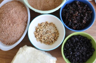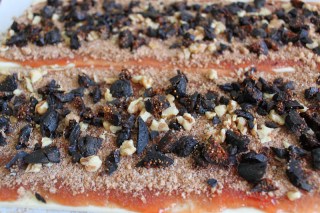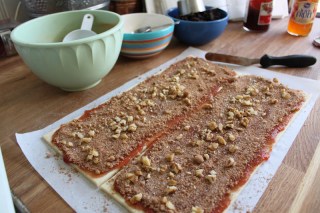 this is where the work was-gathering the ingredients and preparing them for filling the rolls of dough. i used walnuts, figs and cherries.