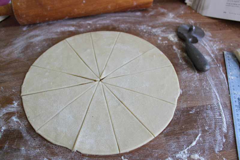so, i took the left over dough and made a round patty with it. i rolled it out into a large circle and cut it into 12 wedges.