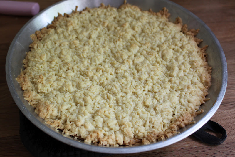 i made my dough the night before and froze it.  then i cut it in half and grated half into my baking pan.  since there is just the two of us, i opted to just make a half batch and i baked it in a pie plate.