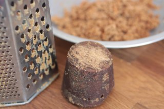 the recipe calls for palm sugar or light brown sugar but i had a cone of piloncillo sitting in the closet and decided to use that despite the recipe suggesting it could lend a darker color.  to get the amount needed, i simply used the large holes on a box grater.