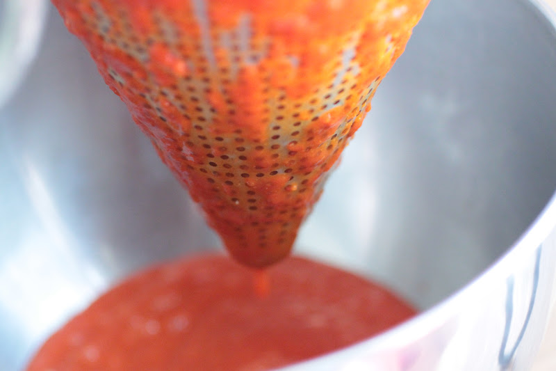 running it through the food mill-you need to let it completely cool first and then blend it before straining it.  warning never try to blend hot liquids in a conventional blender-they will blow the top off and shoot hot liquid everywhere!