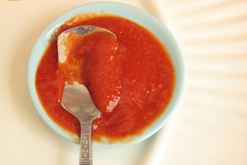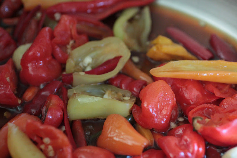 by the end of summer, the tomatoes and cucumbers are long gone but the pepper plants are still pumping out the produce.  i have wanted to make some sriracha and have been waiting for the peppers to ripen.  pictured above, starting from 12 o’clock:  tobacco peppers, hot banana peppers in a range of colors and sizes, thai chiles, korean chiles and in the center-cayenne peppers.  the korean pepper plant gave up its fruit long before the others and i ended up throwing them in the freezer while i waited for the others to catch up.  the process is surprisingly simple and easy and this recipe from viet world kitchen is fool proof.