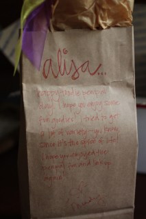 my box came from my partner mindy of just a one girl revolution. the requirements include something written and mindy met that by writing a note and drawing flowers on the bag. it was a lovely touch when i opened the box.