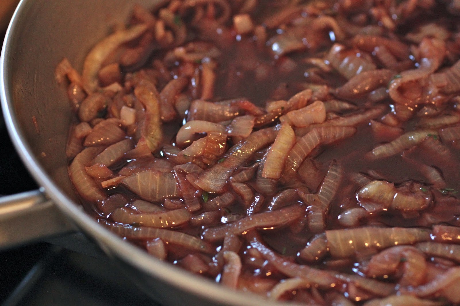 the onions cook and take on lots of color. then a combination of red wine and red wine vinegar is added to them. at this time, it is important to keep the heat very low so that the onions have time to absorb the color and flavor of the wine. they will continue to soften as well.