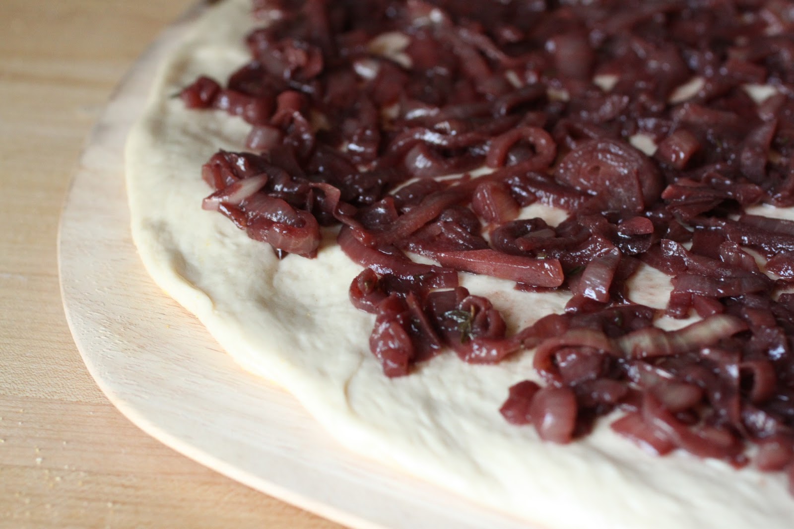 the dough rises and is stretched or rolled out to a large circle that is about 1/4 inch thick. the onions are spread over the top in an even layer. at this time, you can add whatever else you like. the recipe suggested kalamata olives or cheese but i decided to keep it simple and just use the onions.