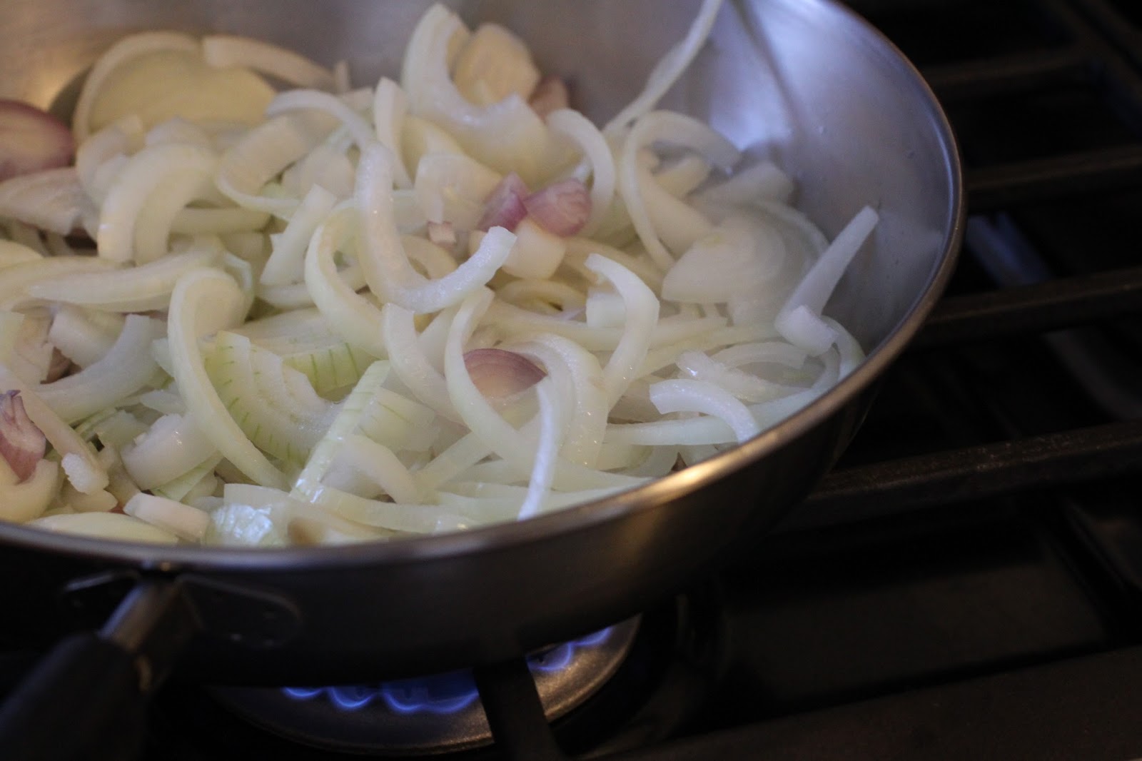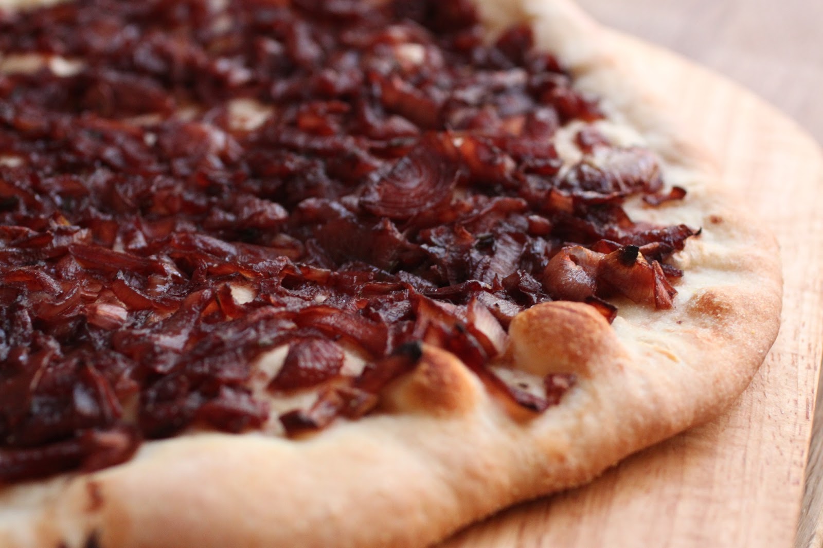 i used a combination of yellow onions, shallots and garlic to make my pizza. and i say that singularly because the recipe can easily be halved-i only wanted one pizza. however, according to the recipe, the extra piece of dough could have been frozen for another time.