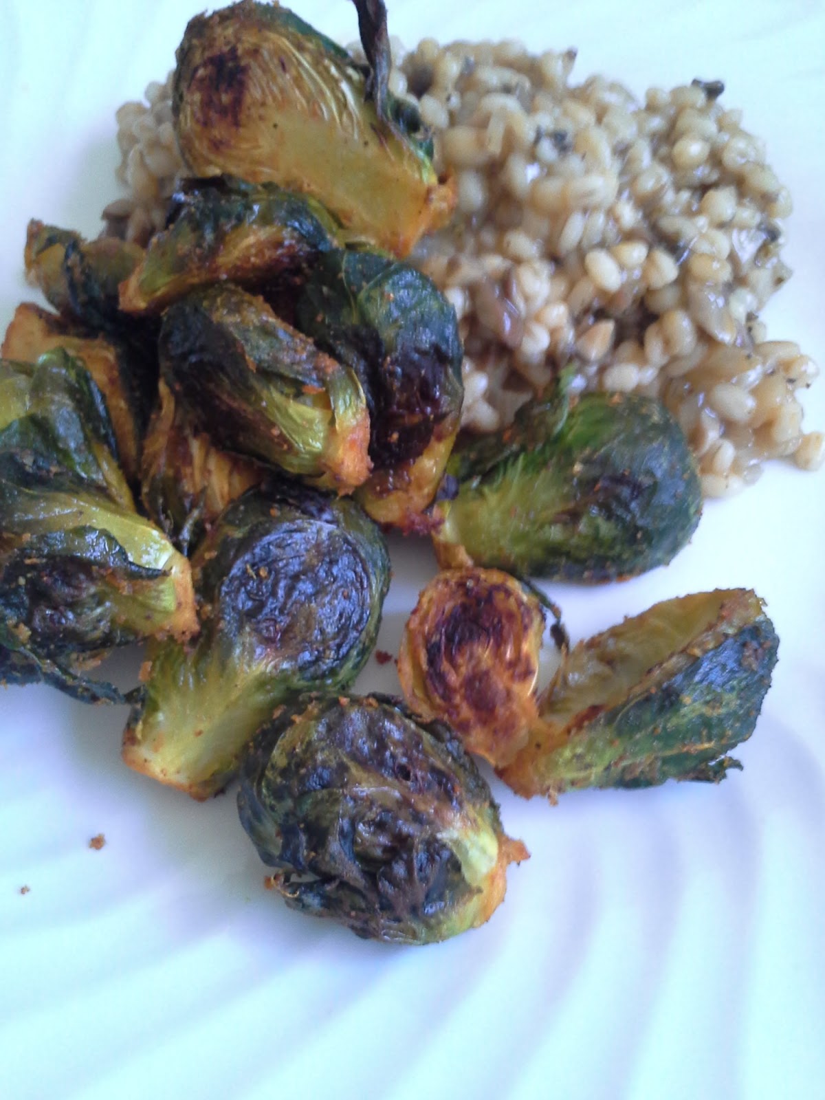 and since a meal of barley seems a little lacking, i roasted up a bunch of brussel sprouts using a recipe for roasted cauliflower steaks. it was simple; mix up the spiced oil blend and rather than brushing it onto thick slabs of cauliflower, then simply coat the brussel sprouts with the oil. they cook quickly and i only had to turn them over once, in short, an easy dish to prepare since the risotto required some attention.