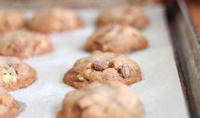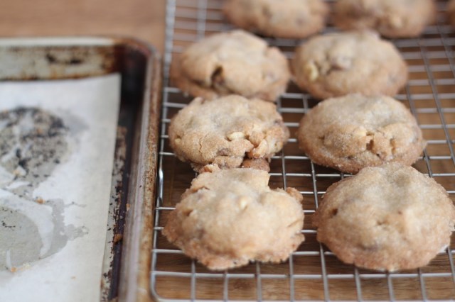 my yearning for that texture, that flavor had me searching for old fashioned cookies and i came across a recipe from daily delicious. i made a test batch, 1/4 of the recipe. in place of butter and oil called for in the recipe, i used only coconut oil. i also added a few extra chocolate chips (just to land at an even amount) and some walnuts because i like them in a chocolate chip cookie. they were good. not what i was hoping for, but still good. the memory persists so the search will continue…