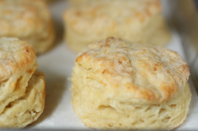 biscuits have always been a favorite of mine, specifically yankee biscuits. crispy and flaky on top, they practically beg you to slather them with butter. yankee biscuits are made by cutting cold butter or shortening into the flour and baking powder. keep in mind that the flour is not self rising, you would be hard pressed to find it up north. the dough is patted out so that it is at least as thick as your fingers and then cut. when they bake, they rise up and the flaky layers almost looked stacked on top of each other.