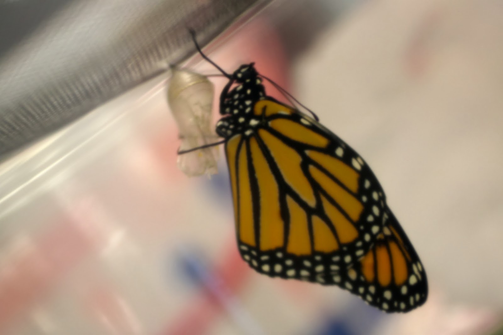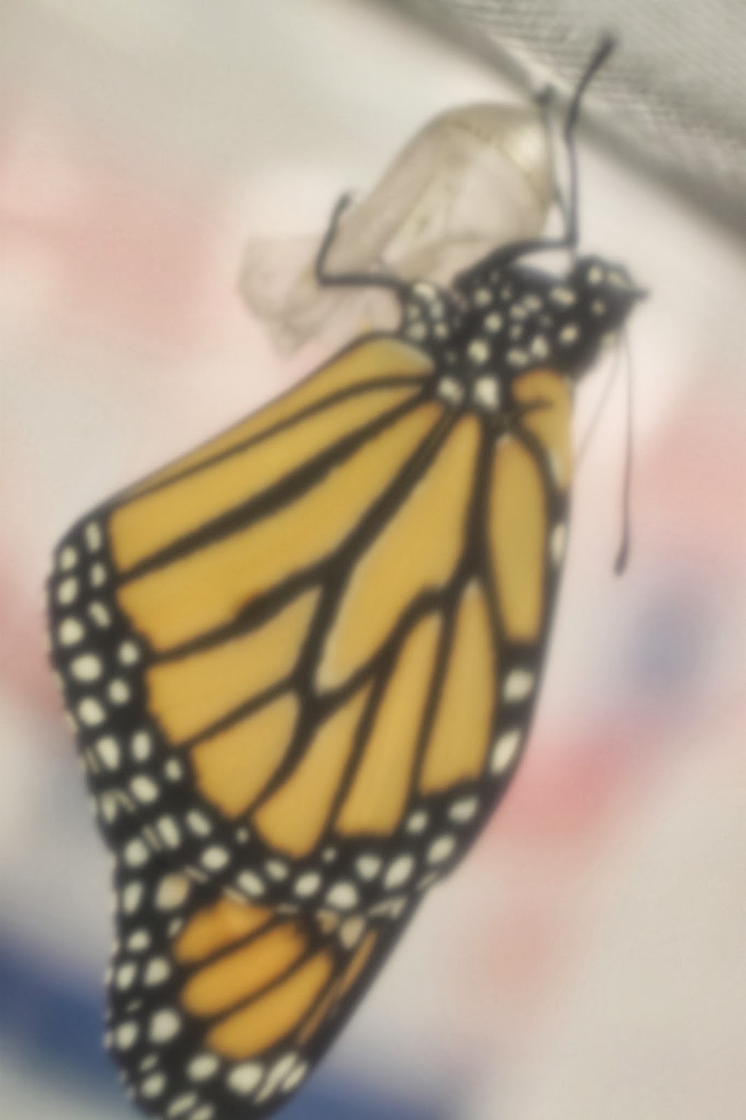 on this day, one monarch decided to join the festivities by coming out of the chrysalis shell. it was a complete surprise to everyone-especially the children in attendance. while the wings unfurl and dry, butterflies are extremely vulnerable to predators. this one was lucky that miss becky took it inside-the cool temperatures would have made it even harder for it to fly away.