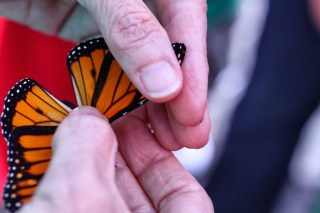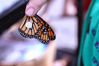 it takes a minute or two for the butterfly to become accustomed to the tag on its wing but once they are, they can fly just fine.