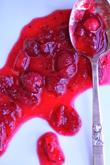 to make it easier to remove them, put the vanilla pod(the seeds can go in with the rest of the ingredients) and the star anise into a spice/tea ball and hang it from the side of the pot. place all of the ingredients in a large pot with 3 cups of water and bring it to a gentle boil. continue to cook until the berries burst and cook down a bit and some of the liquid reduces. the longer you cook it, the thicker it will be and the less sour the berries will taste. remove the teaball and drain the liquid back into the pot and discard the vanilla pod and star anise pods and also remove the cinnamon stick, allow it to drain as well. chill it completely before serving. this is something that can be made as much as a week in advance so take advantage of that!
