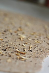 to keep it interesting, i also changed the topping on each sheet of dough. these were simply sesame seeds.