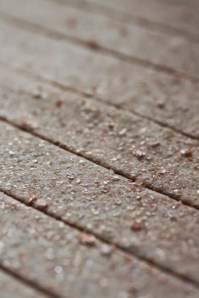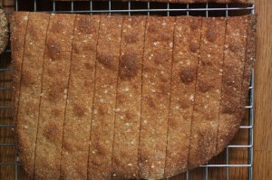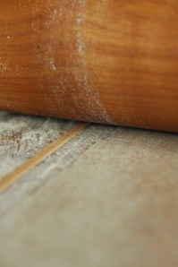 to make thin, crispy crackers, it is necessary to roll the dough out as thin as possible and to roll it out so that it is all the same thickness. to do this, i used a pair of 1/16″ thick dowels. the dowels prevent the rolling pin from going any further and the result is a consistent thickness throughout the sheet of dough.
