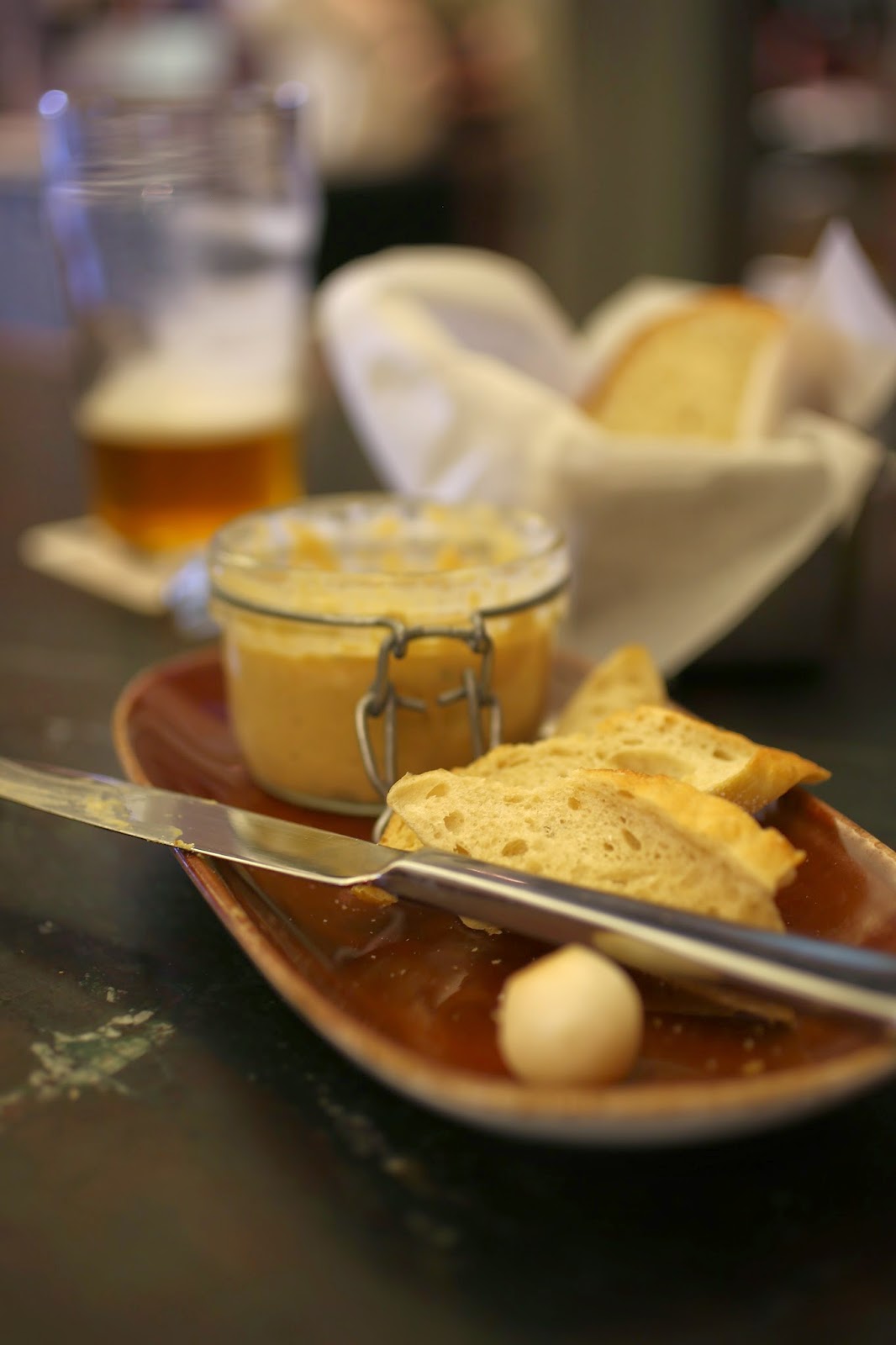 after spending much of our time just wandering gardens, we ventured back to merchant square and into the dog street pub for what we thought would be a drink in the bar and a chance to cool off and get out of the hot sun. we sat at the bar sipping drinks; a glass of pinot grigio for me and a glass of the founders pale ale nitro for darry. since we were a bit tired from all of the time spent driving, a little overheated from the hot summer sun and apparently hungry, darry decided to order something to snack on. we started out with house made hummus. the lovely presentation of a glass jar and freshly baked croutons was almost too pretty to dig into. the light, creamy hummus was made with just the right amount of garlic and lemon and was just what we needed to accompany our drinks.