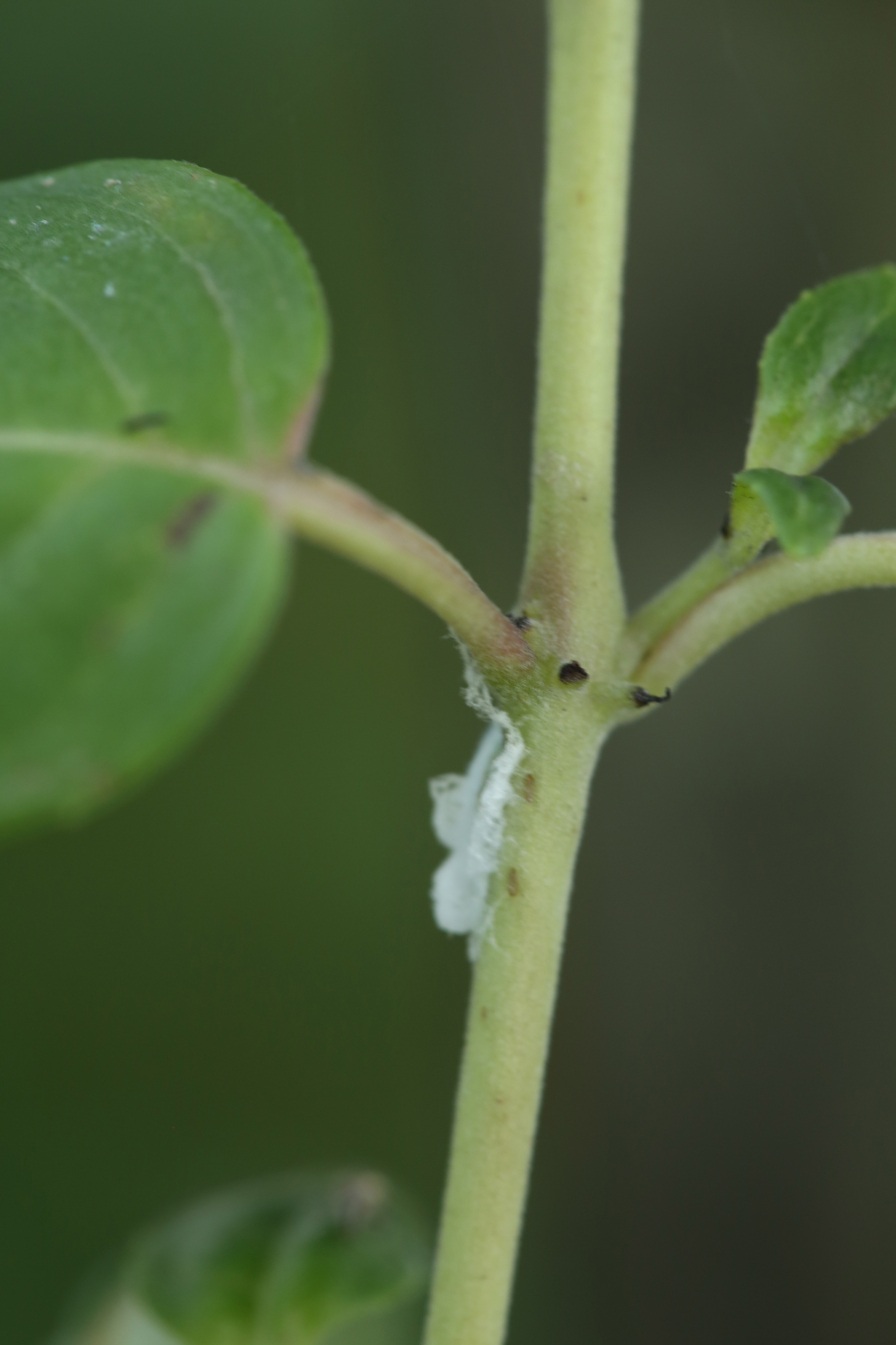 Pulling out last seasons plants to make way for the next wave is just one task on the gardening “to do” list.  Keeping the bad bugs at bay will also keep you busy.  Even if you just garden with flowers, there will be battles with bugs!  In my new shade beds, I discovered some wooly aphids in one of my hanging planters.  The fluffy white stuff on the stem in the photo above is actually a few wooly aphids.  As you walk through your garden looking for signs of pests, be sure to lift the leaves and look carefully at the whole plant including the undersides of the leaves.
