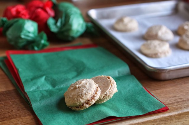 To assemble the cookies, on one half of the cookies, spread a thin layer of the raspberry paste on the bottoms. Set each one, paste side up on a clean tray. On the other half of the cookies, spread about a teaspoon to a teaspoon and a half of the ganache over the bottom of the cookies. Pair the cookies together so that each has a raspberry and a chocolate cookie and gently press them together. Allow them to sit long enough for the ganache to completely set and then you can package them to give as gifts. Mine are rolled into clear cello with the ends tied shut.