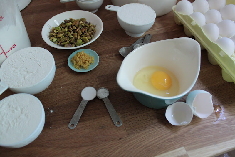 first step was to measure out all of the ingredients.  since my pistachios were already skinned and toasted, i eliminated the blanching and toasting step from the recipe.  actually, whenever i make biscotti, i always use untoasted nuts.  the reason behind this is that they have the potential to become over toasted in the second bake and that can give the biscotti a bitter and burnt taste.