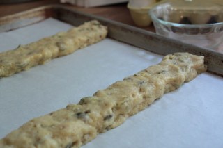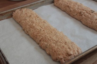 To shape the biscotti, divide the dough into 2 or 4 equal pieces. Stretch the dough out so that it is the length of the pan, about 16″ long, and then pat it down to about 3/4 inches in height. The larger sized logs will be nearly 3 inches wide while the smaller ones will be around 1 1/4 inches wide. If the dough seems too sticky to work with, moisten your hands with a small amount of cold water and then shape them. Bake the logs until they are slightly firm and spring back when pressed, about 25-28 minutes for the large logs and 20 minutes for the smaller ones. Allow them to cool for at least 4 hours, or over night before slicing.