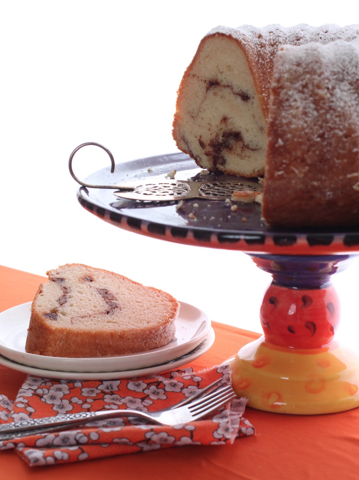 preheat the oven to 350.  grease and flour the cake pan and set aside.  place the butter, sugar, salt and vanilla into the bowl of a food processor.  pulse to combine.  add the eggs, one at a time and pulse to combine.  scrape the mixture into a large mixing bowl.  place the flour and the baking powder into a sifter or a mesh strainer and sift it over the batter in the bowl.  fold the batter a few times, add the buttermilk and mix until no streaks remain.  carefully spoon 1/3 of the batter into the prepared pan.  sprinkle half of the cinnamon sugar over the batter and then top it off with half of the chocolate chips and nuts.  carefully top this with half of the remaining batter and carefully spread it into an even layer.  sprinkle the remaining cinnamon sugar, chocolate chips and nuts over the batter and then top it off with the remaining cake batter.  spread the top of the batter so that it is even and touches the sides and middle core of the pan.  bake until a pick inserted comes out clean, about 1 hour to 1 hour and 15 minutes.  allow the cake to cool in the pan for 15 minutes and then invert it onto a rack to cool completely.  when the cake is cool, sift a little powdered sugar over the top.  cut with a serrated knife.  leftovers, if there are any, will freeze nicely.  just wrap slices well and freeze for a month or two.  to defrost, let the slices sit out at room temperature with the plastic still on them.