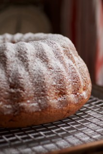 this is a moist cake that is quickly mixed up in one bowl and baked in a medium sized (about 8 cups) bundt pan.  rather than make a glaze as the recipe called for, i opted for a more finger friendly dusting of powdered sugar-we don’t have the time for plates and forks in the garden.