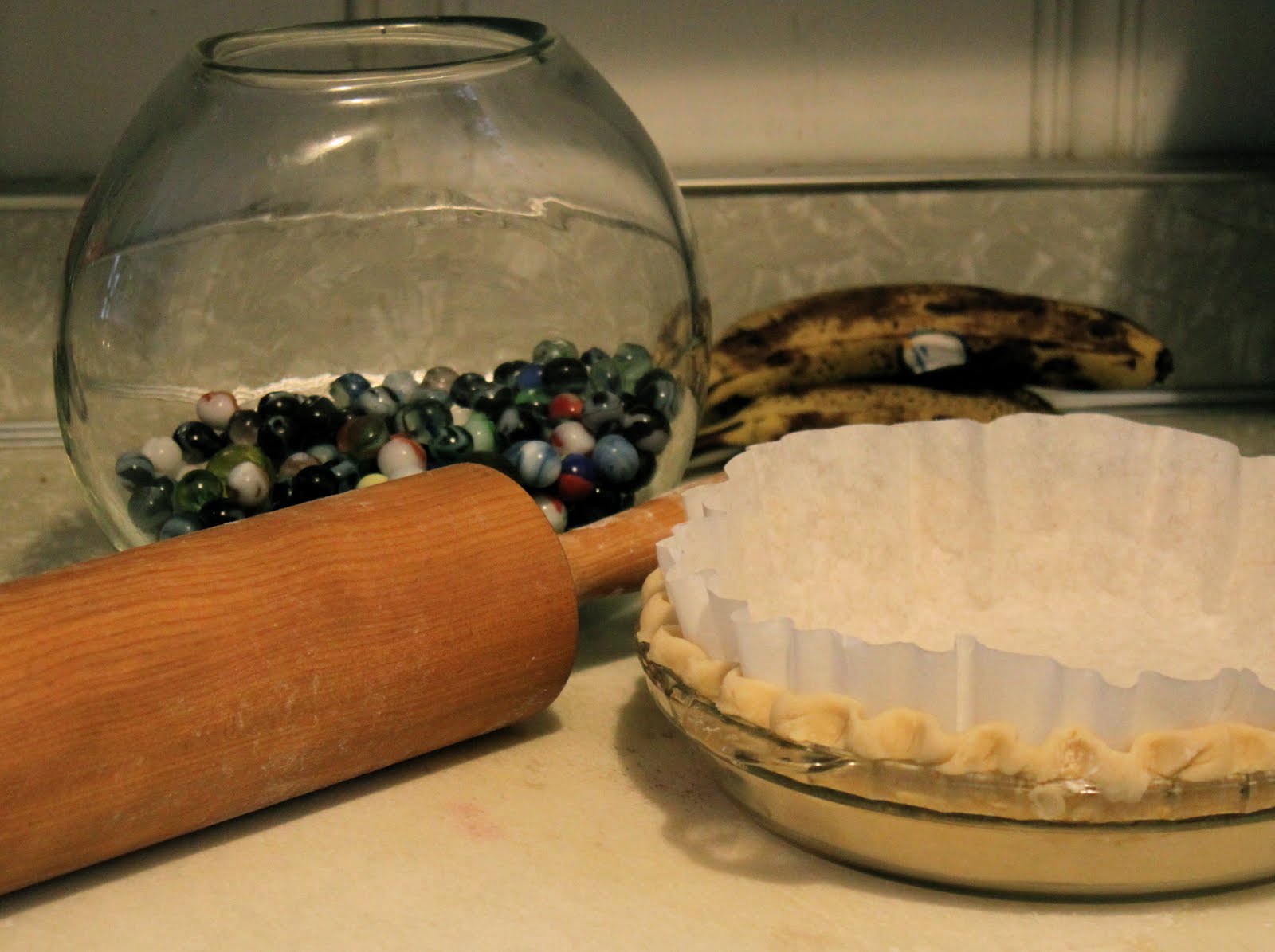 preheat the oven to 350. roll out the crust, carefully transfer to a pie plate and flute the edges if desired. line the crust with coffee filters or parchment paper and fill with weights. bake until lightly browned around the edges and the bottom (on the inside of the shell) is no longer shiny. remove the weights and prick the bottom a few times, return to the oven and allow the bottom to bake a little longer.