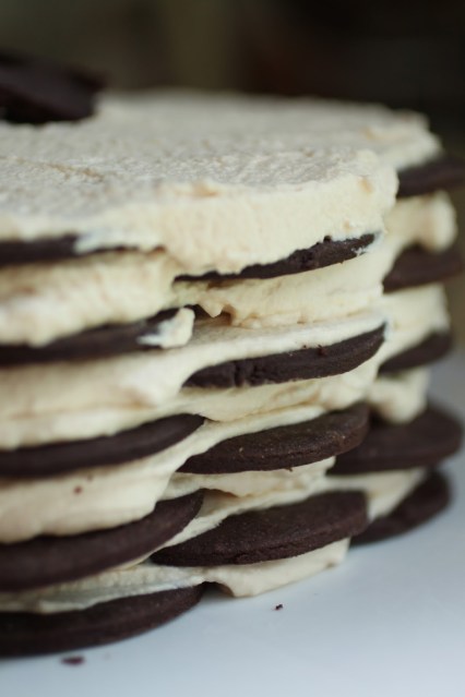 have a heat proof bowl with a mesh strainer over it handy-you will need it for the custard. place the rum in a microwavable dish and sprinkle the gelatin over it, set aside. place the egg yolks and cornstarch in a heat proof bowl and add a small amount of half and half. whisk until all of the cornstarch is dissolved. pour the remaining half and half and 1 cup of the sugar into a sauce pot. place over medium heat and stir to dissolve the sugar. bring to a gentle boil and temper the yolks by pouring a small amount of the hot half and half into the yolks while you whisk them-you must whisk them or you will scramble them. continue whisking the mixture as you pour half of the hot mixture into the yolks. place the remaining hot half and half back onto the stove at medium heat and begin whisking the milk. while you whisk the half and half, pour the tempered yolks into the pot. continue whisking the custard in the pot until it comes to a boil. allow it to boil gently for a minute to cook the starch. place the gelatin mixture in the microwave and on the lowest setting, heat the mixture to bring it to a liquid state in 10-15 second intervals. add the chocolate to the hot custard and whisk until it is melted. add the liquid gelatin and stir to combine. pour the custard base through the strainer into the heat proof dish. press plastic wrap to the surface(to prevent a skin from forming) and place in the fridge. do not allow the mixture to get completely chilled or the gelatin will set, you just want it to get cooled enough to add the whipped cream without melting it. it will take a while and you may have to stir it to keep it from setting around the edges.