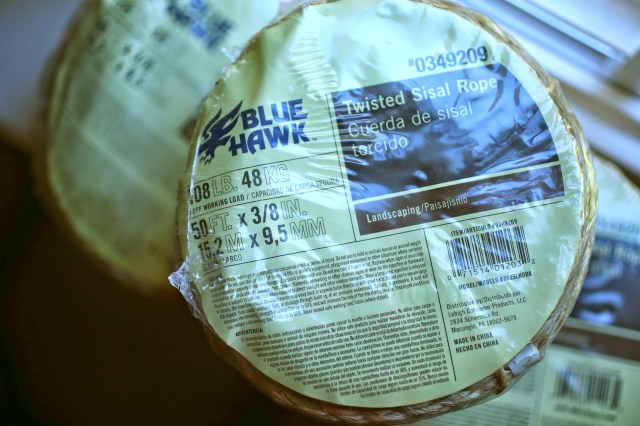 The post took a lot more rope than I thought it would. So far, I have wrapped it with seven 50′ coils and I still need at least 1 more. The good news is that he will go to it and sharpen his claws. We still need to work with him on this, he is not using it exclusively but he is using it. If it means I will not be refinishing every wood surface and replacing furniture in the house, it is a success. The down side, it is not a cheap project. The rope is $9 per coil plus the cost of the lumber. In my opinion, if it means less damage, it is cheaper than a new couch!
