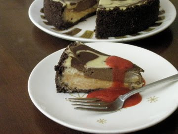 on more than one occasion, i have listed my fool proof hints for baking a perfect cheesecake and you can read some of them here or read the entire article here-i apologize in advance for the commercial. but if you read them, they will help you reach cheesecake nirvana. one of my rules for cheesecakes is to bypass the graham cracker crumbs. they are an awful addition to a cake that you have just invested a bit money on-chocolate and cheesecake are not necessarily cheap. my preference is to use my own cookie crumbs made from my biscotti recipe. by mixing up a batch of my own cookies, i can flavor them how ever i see fit and i can tailor the crust to the cake. biscotti crumbs also keep well in the closet. if you are not inclined to mix up a batch, buy some that have not been dipped in chocolate so that they are not oily after you grind them up.