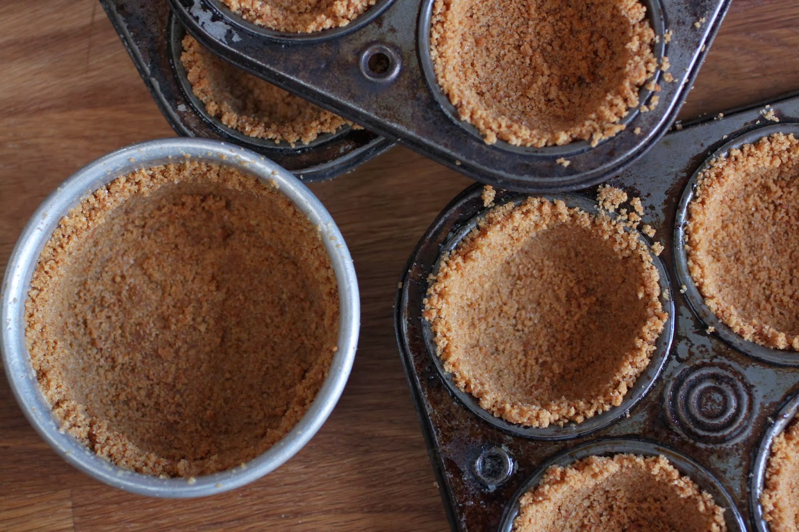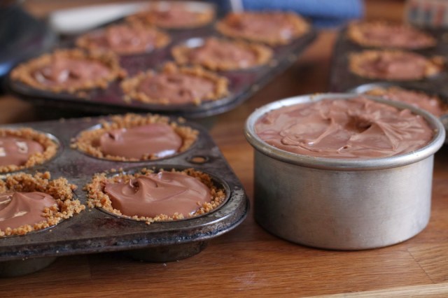 to make the cakes so that serving them at a potluck would be easy, i filled muffin tins with a crumb crust and baked little individual cakes. the recipe called for using cookie crumbs to coat the bottom of cake after it is baked and turned out of the pan. this idea sounded a little wacky to me, actually it sounded like a lot of work that just wasn’t necessary. but this is the sort of thing you will encounter every time you bake a cheesecake in a water bath while using a springform pan or one of those specialty cheesecake pans with a removable bottom. a very long time ago, i abandoned this method because water baths are a pain in the…well, you know what i mean.
