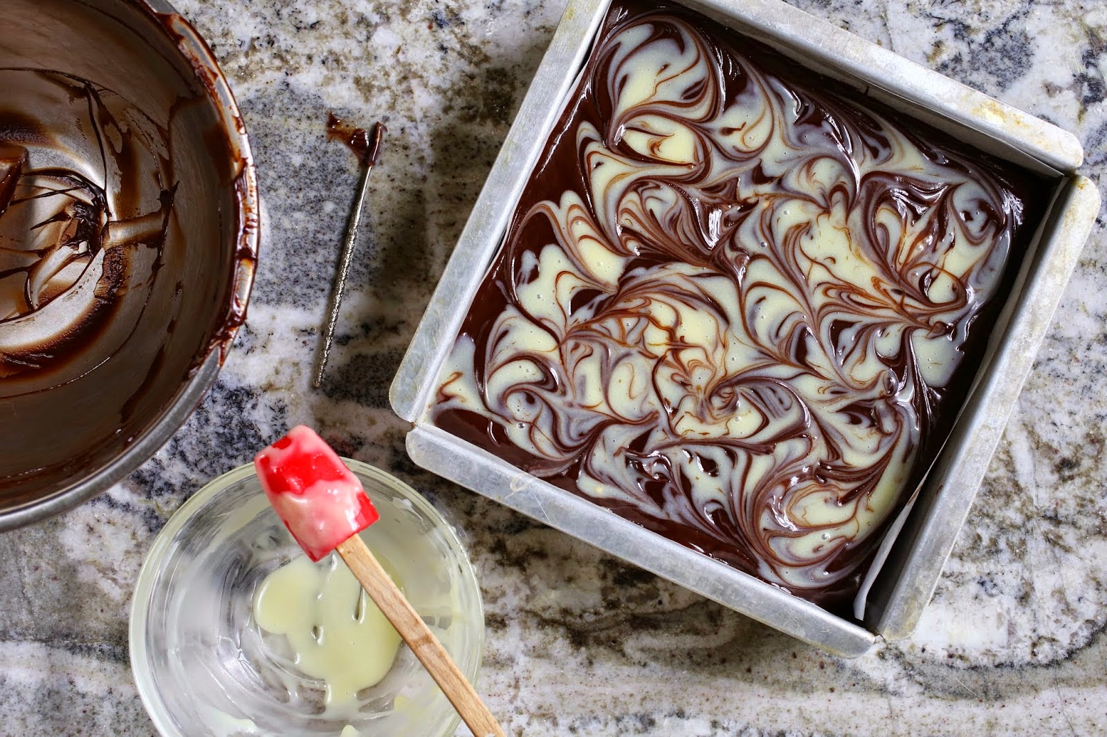 the recipe uses a pound of chocolate. twelve ounces of bittersweet chocolate and four ounces of unsweetened chocolate. the recipe instructs you to melt half of the bittersweet chocolate with the unsweetened chocolate. the other six ounces of bittersweet chocolate is cut into chunks and stirred into the batter. since i think there can never be too much chocolate, i went ahead and added an additional six ounces of white chocolate chunks with the bittersweet chunks.