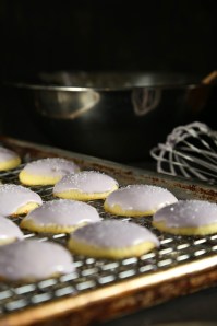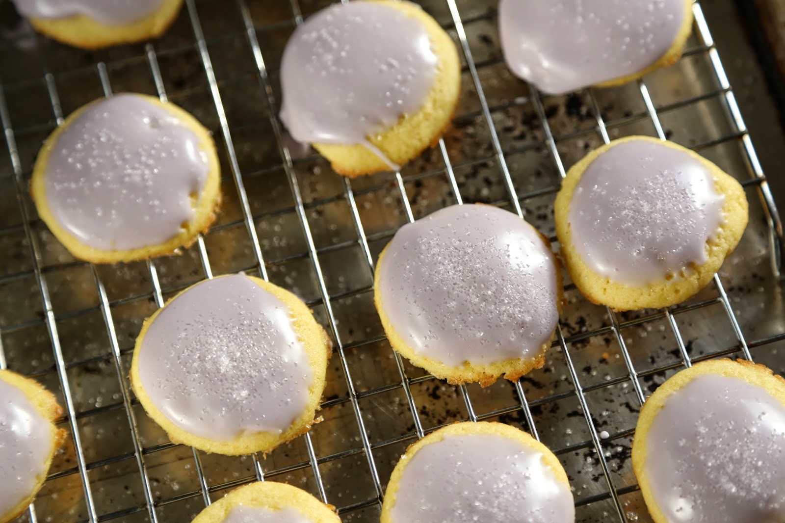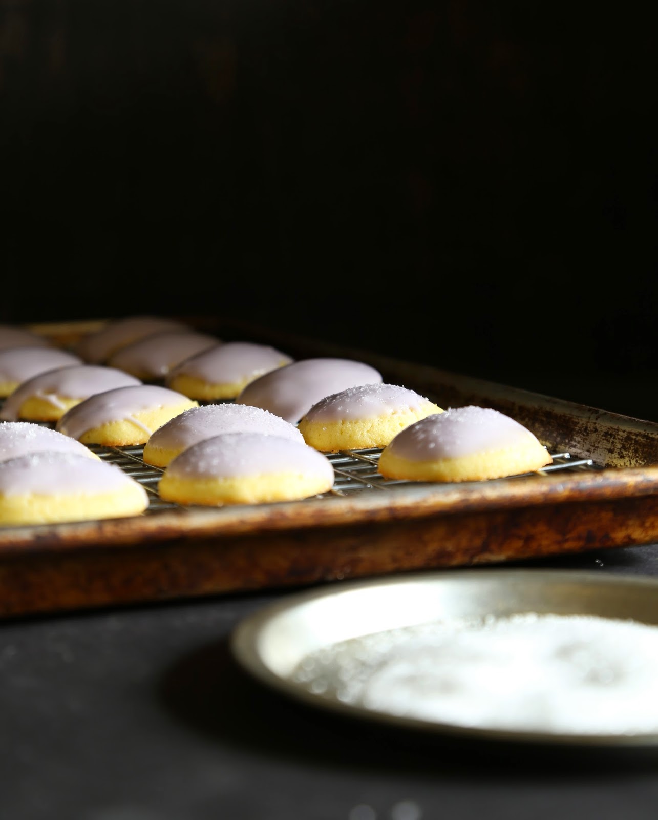To dip the cookies in white glaze was too easy, almost boring if you ask me.  So just to make them a little more colorful, I tinted the glaze with a bit of purple hoping for a nice lavender shade.  Let me just say that no matter how hard you try, it almost always ends up looking a little too much like grey. To prevent that from happening, I also added a tiny amount of red to the mix.   A little sprinkle of clear sugar crystals on top gives them a bit of sparkle too!