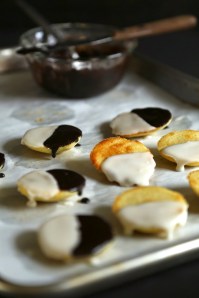Not sure what a black and white is?  You can read about the history of them in this article by Robert Sietsema.  To make a batch of your own, use the palet de dames cookie recipe and mix up some chocolate and vanilla glazes or try this recipe from the New York Times.