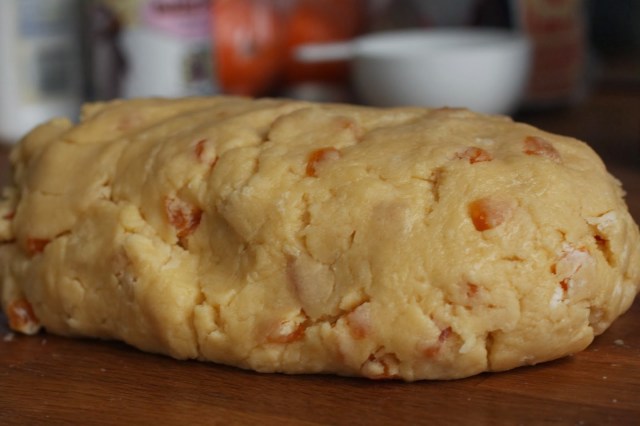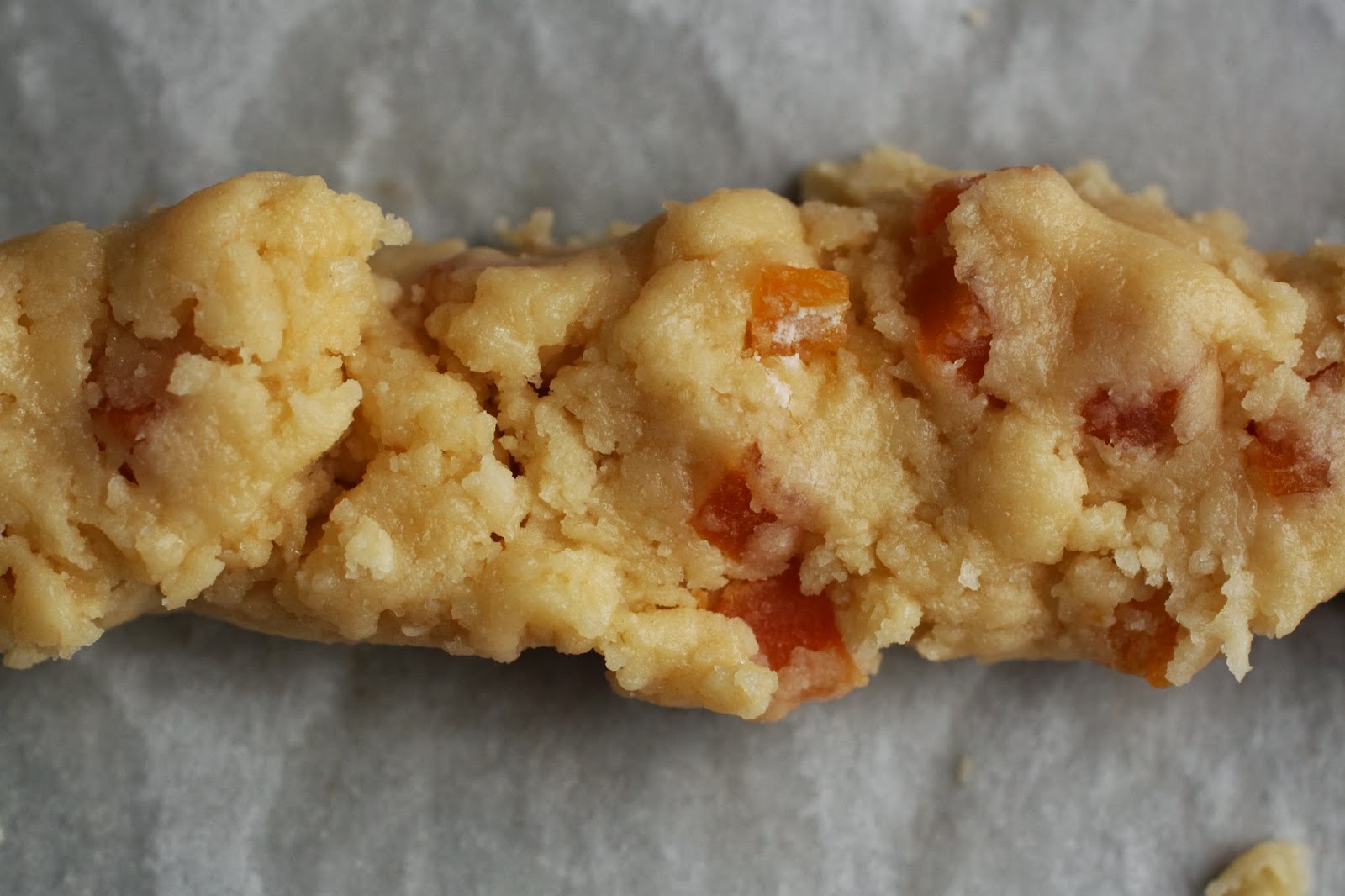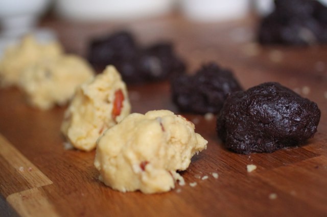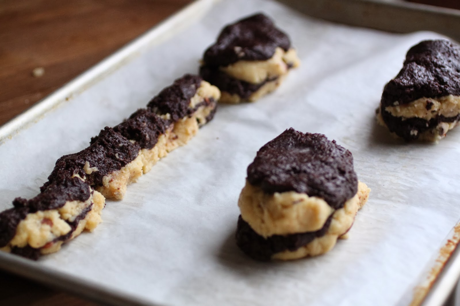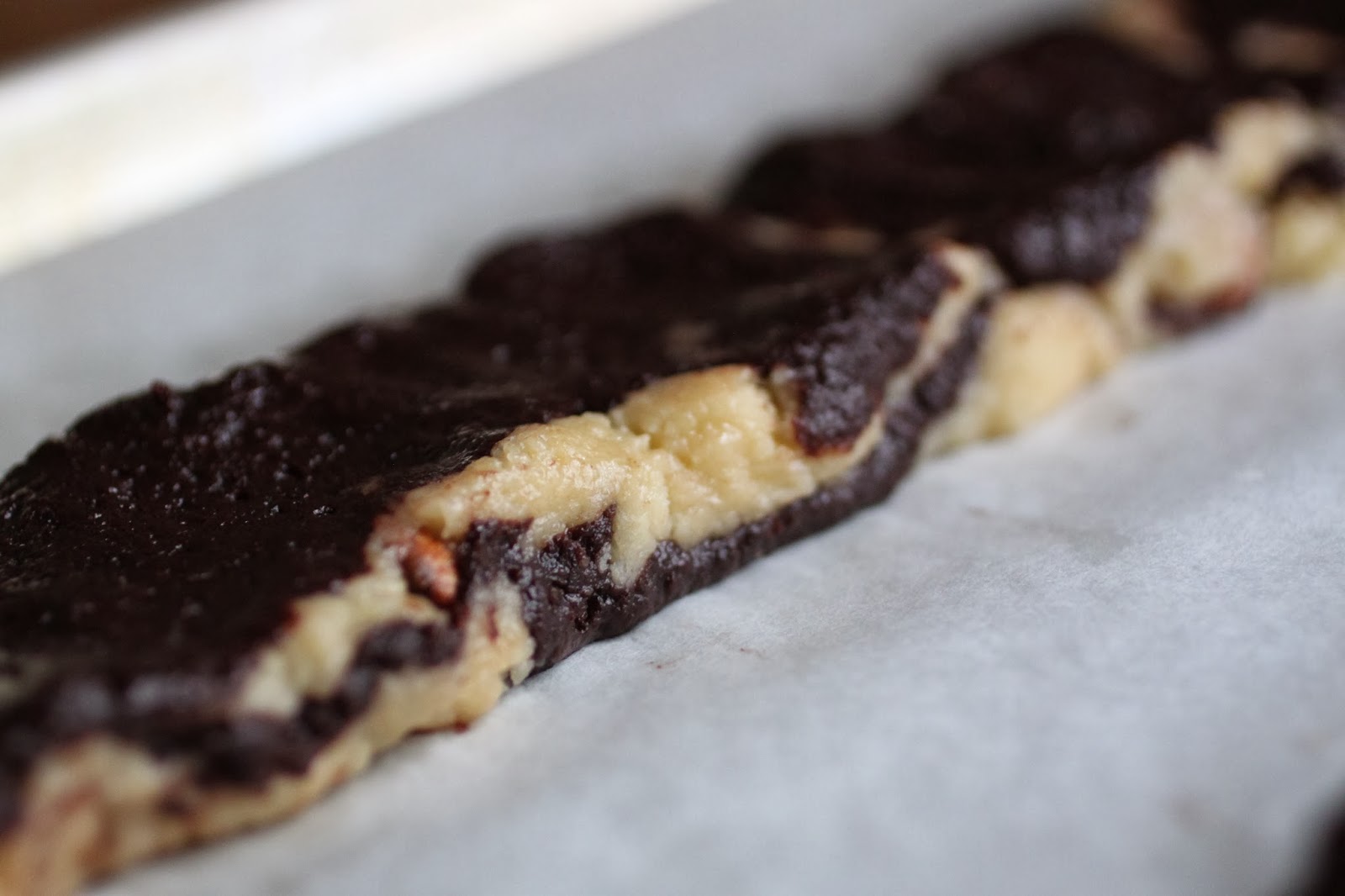 just like the apricot biscotti, the dough is portioned out.  the two doughs are stacked and are now ready to make marbled logs.