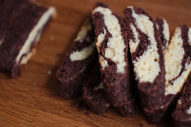 for the rest of the family, i make something chocolate.  this year, i made marbled almond biscotti.