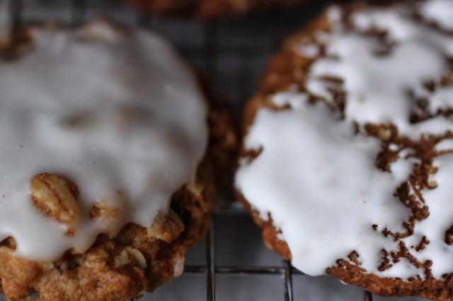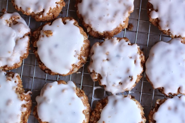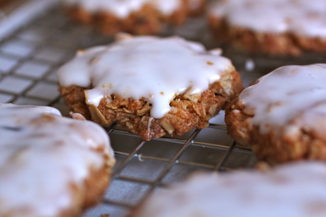 my latest baking obsession, iced oatmeal cookies.  no, i cannot explain it.  of course, i have always liked oatmeal cookies, especially oatmeal cookies with dried currants in them.  and yes, i have always preferred them to be homemade and warm from the oven.  even so, i really like the ones that come in a bag with the hard white frosting.  crispy cookie and crunchy white frosting.  go figure.