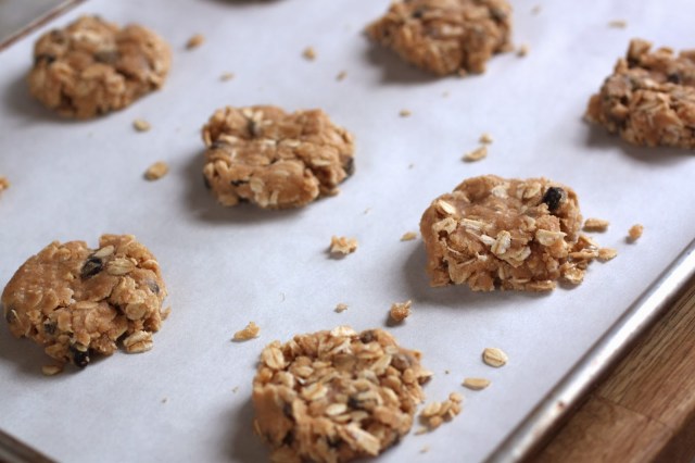 coconut oil and whole wheat flour make a drier batch of dough.  i gently pressed each of the cookies down to form a thick disk before i put the pan in the oven.  the results were a cookie that was dense and not as crispy as butter would have made them.
