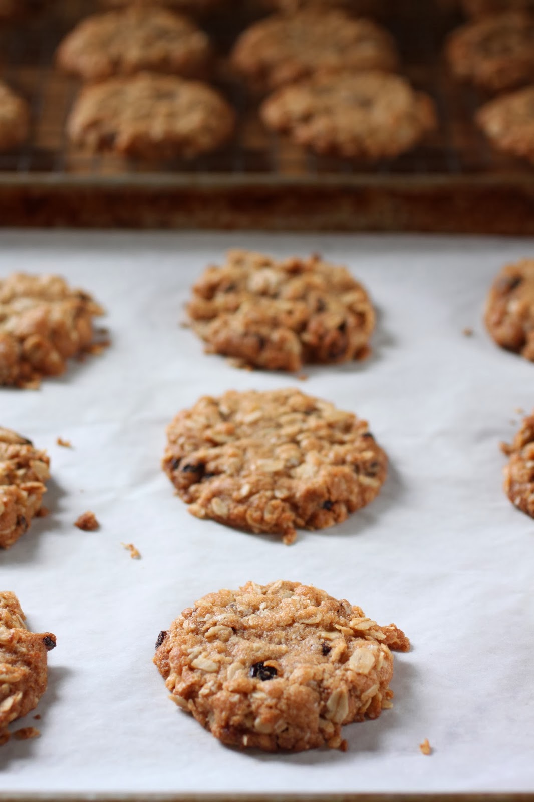 preheat the oven to 350.  in a bowl, combine the oats, whole wheat flour, salt and baking soda and whisk it to combine, set aside.  in a mixing bowl, combine the coconut oil, brown sugar, molasses and salt and mix at medium-low speed until fluffy.  add the egg and water and mix until combined.  pour the combined dry ingredients in and mix on low speed until it starts to come together.  add the currants and mix until combined. scoop out the cookies using a small (#40 or #50 if you can find one) portion scoop and place them on paper lined sheet pans.  bake until lightly golden and a little puffy, about 10-12 minutes.  cool completely before glazing.