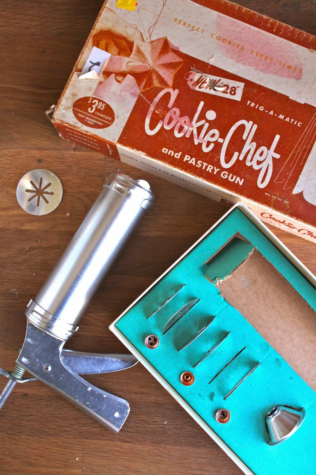 several years ago, i scored this vintage cookie press on ebay.  it has lots of disks to make many shapes.  the box is in nice shape too and even has the original price on it, $3.95.  try and find a new set this nice for that price.  i love the trigger action, it works perfectly.  the only advice i can give you, press them directly onto the sheet pans; do not use paper or grease the pans!  the reason, the cookies will not separate from the gun and you will find yourself getting rather irritated when you have to peel each one off and put it on the pan…yes, that is experience talking.
