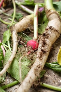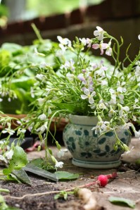spring gardening means lots of radishes. the familiar red spheres are so pretty and colorful; a perfect accent or garnish. radishes are enjoying a moment now and there is no shortage of shapes or colors available to dress up your salad or hors d’oeurves . the entire plant is edible though so think twice about discarding the leaves and flower stalks as you pick them from the garden.